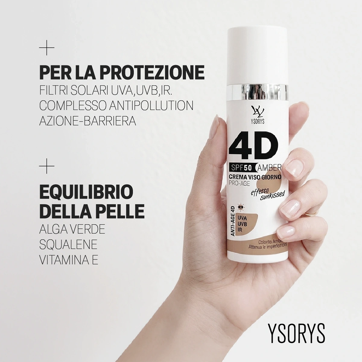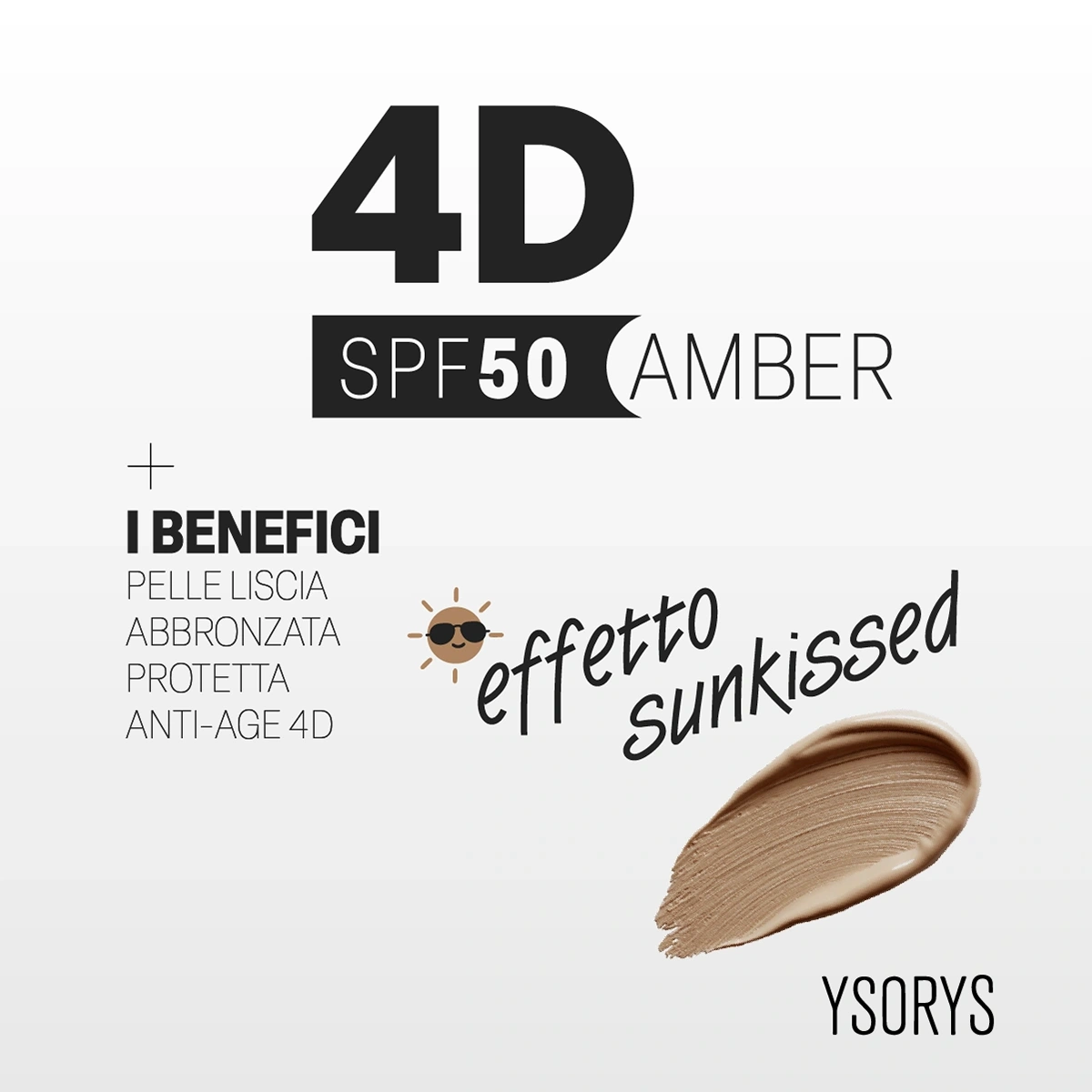 4D AMBER è un trattamento completo ad effetto “Effetto Sunkissed” che dona un colorito ambrato alla pelle e combatte attivamente i segni del tempo; la presenza di una particolare alga verde preserva il tono e l’elasticità della pelle, stimolando la sintesi di collagene. Uniforma il colorito rendendolo più abbronzato, e attenua le imperfezioni: la sua tonalità attenua le imperfezioni, donando immediatamente una pelle dall’aspetto più giovane, ed estivo. Completata da Filtri Solari organici UVA, UVB e IR .