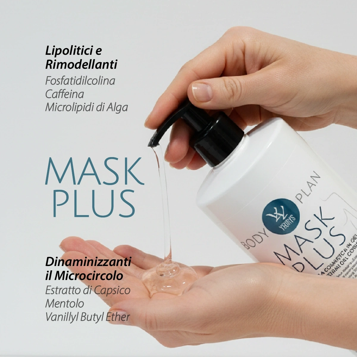 Dal punto di vista chimico-funzionale, MASK PLUS è un attivatore metabolico a contrasto termico. Rappresenta il "motore" che stimola il tessuto in profondità: la sua formula in gel-emulsione funge da veicolo per gli attivi lipolitici e fibrolitici, mentre la sua azione termica controllata promuove la riattivazione del microcircolo e del metabolismo cellulare. È il prodotto che "sblocca" i tessuti compatti, preparando i noduli adiposi e le fibre indurite a essere trattate con successo.